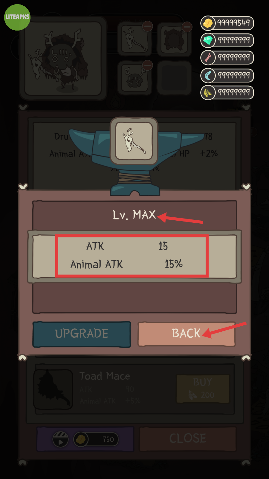 4、将装备升至【Lv.MAX】,获得【ATK-15】和【Animal-ATK-15%】的满级属性后,点击【BACK】返回继续游戏。
