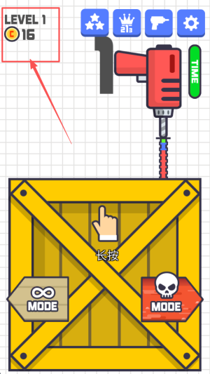 1、首先,长按屏幕上的“长按”按钮开始游戏,观察电钻的移动。