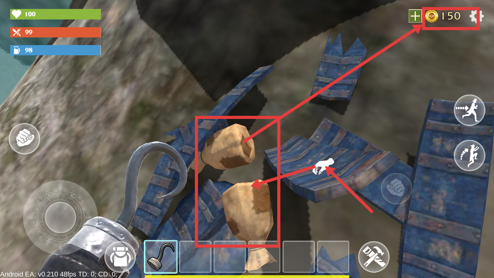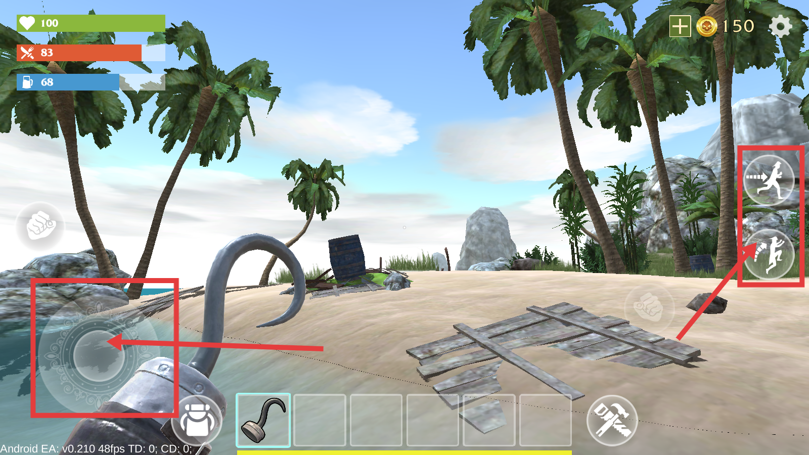 1、操控角色,利用【移动摇杆】移动,结合【跑步】【跳跃】功能,探索沙滩场景,收集资源,开启生存冒险。