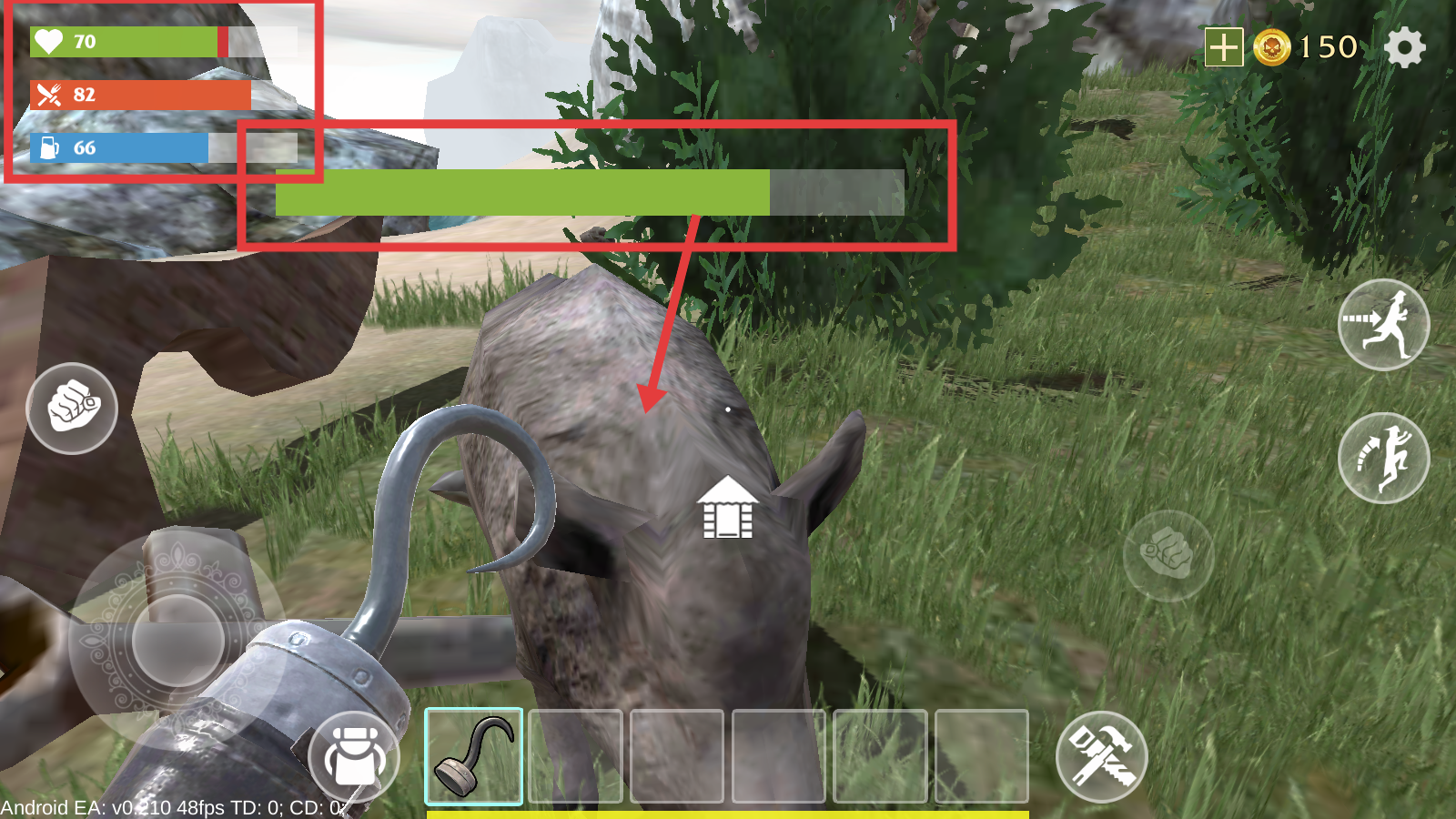 3、注意【生命值-70】【饥饿值-82】【口渴值-66】的消耗,避免与大型动物冲突,及时寻找食物和水源维持生存。