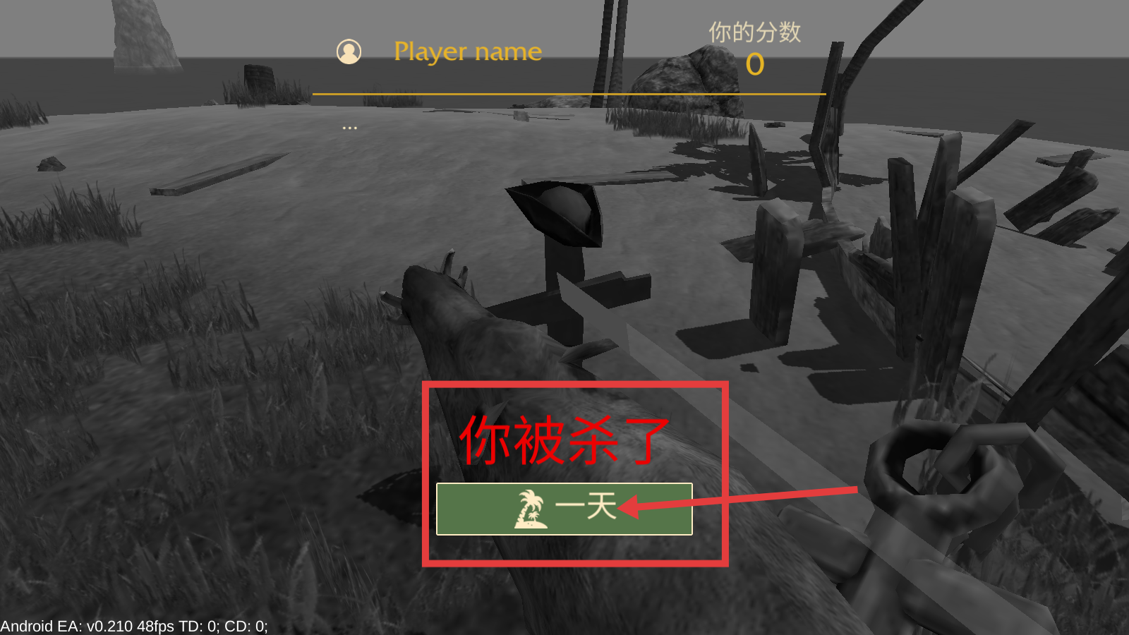 4、若角色死亡,点击【一天】重新开始,总结经验,做好资源管理和危险规避,提升生存时长。
