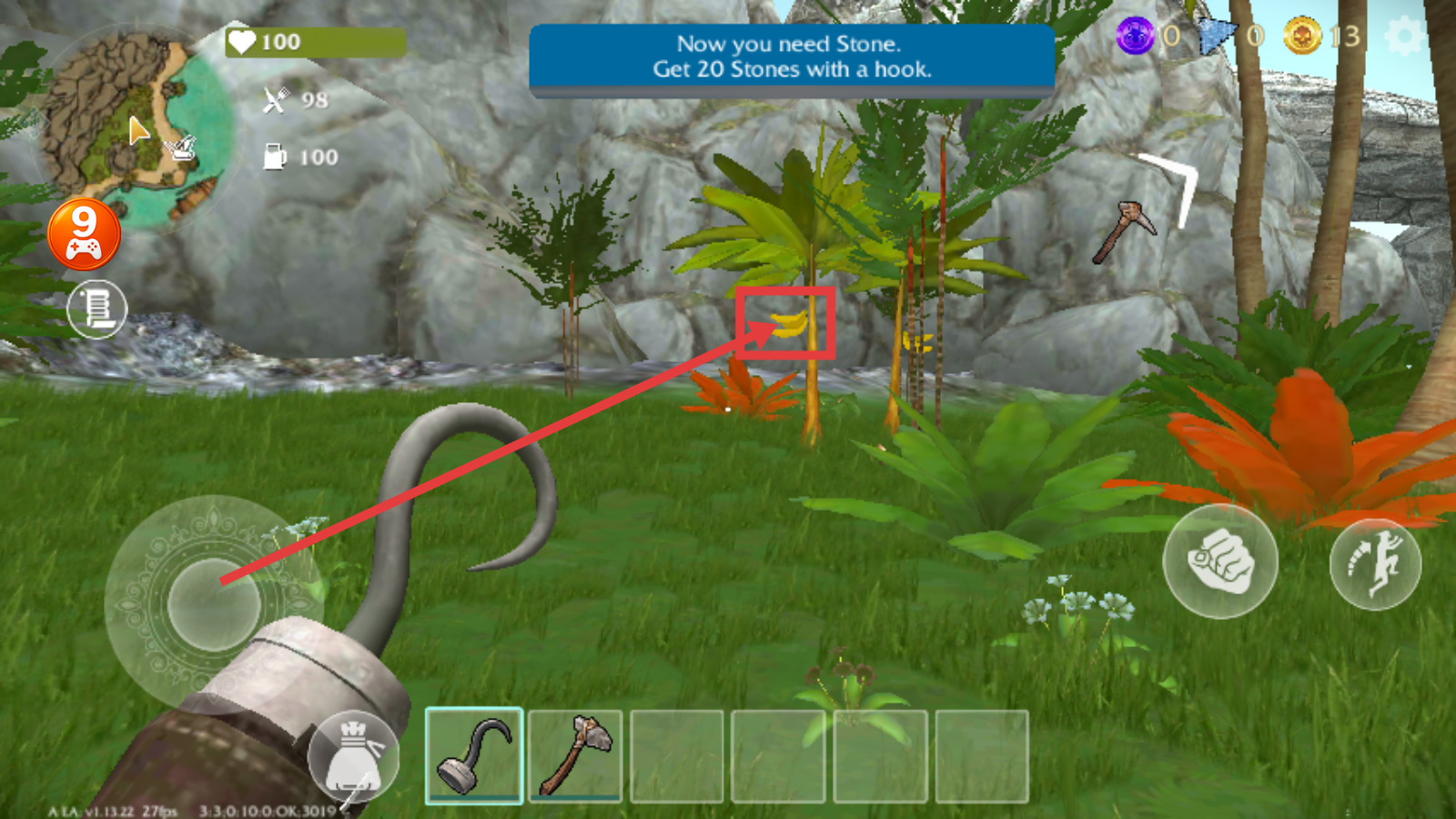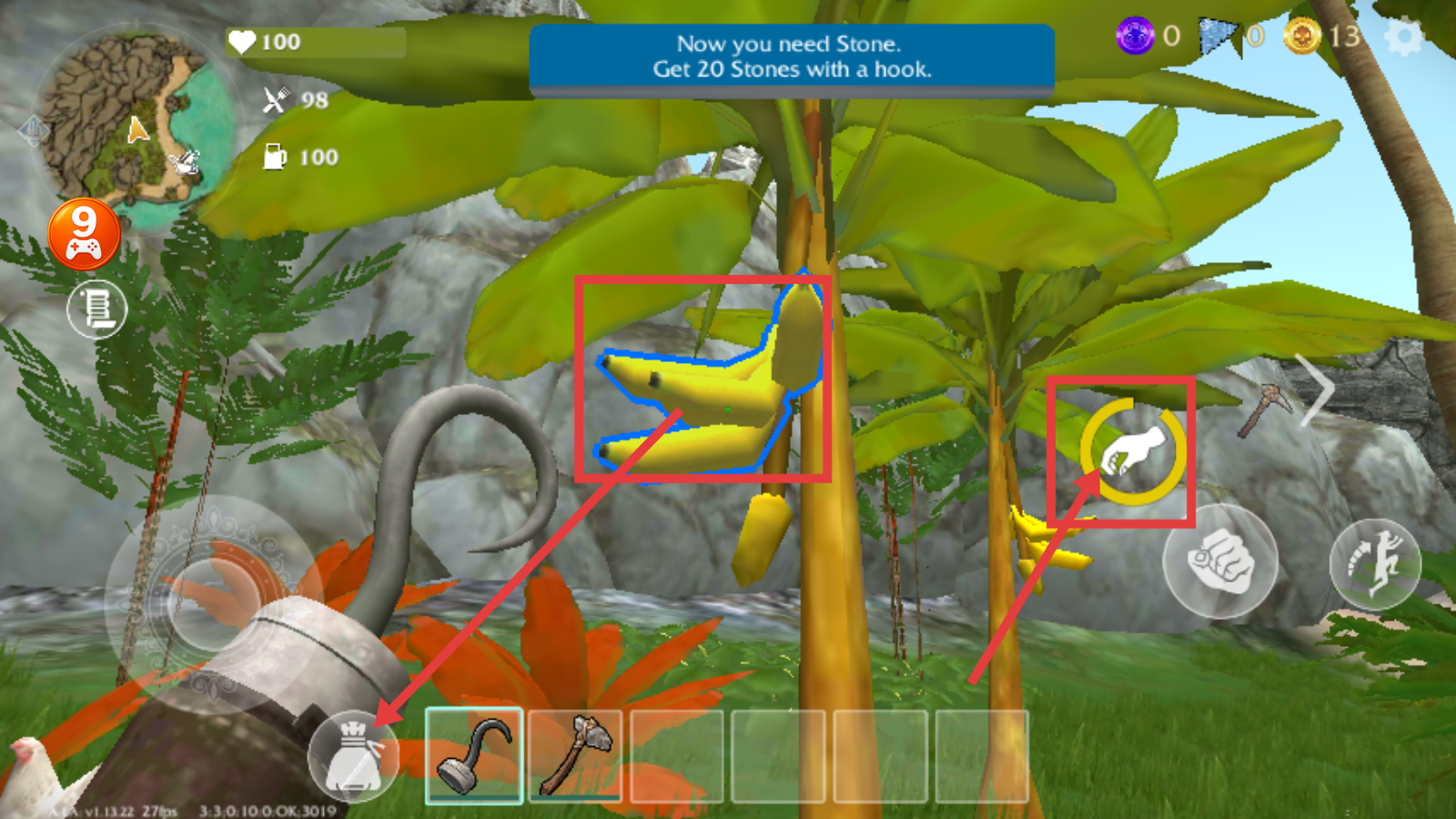 1、操控角色移动,发现香蕉优先收集,维持饥饿值,同时推进【收集20块石头】的任务,保障生存与任务并行。
