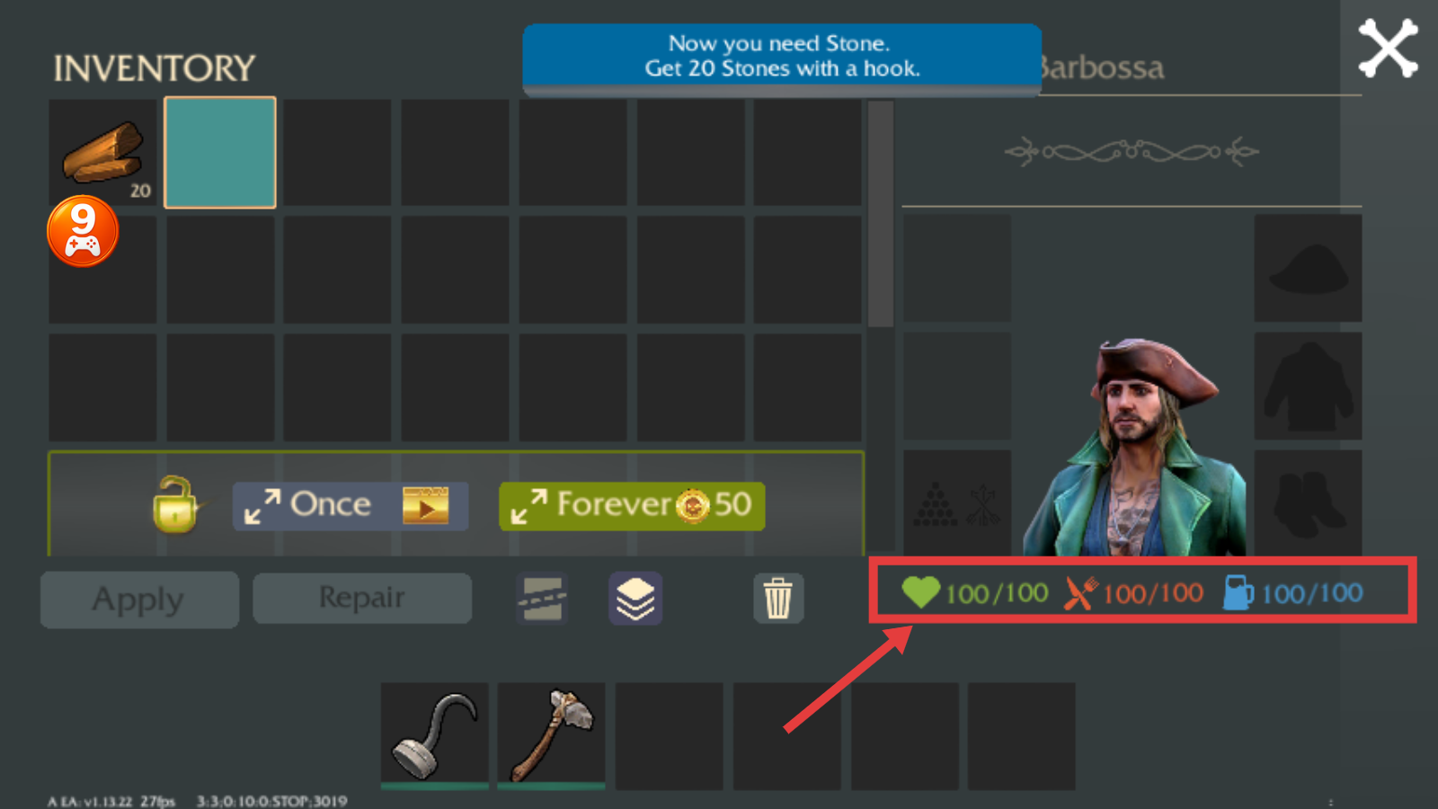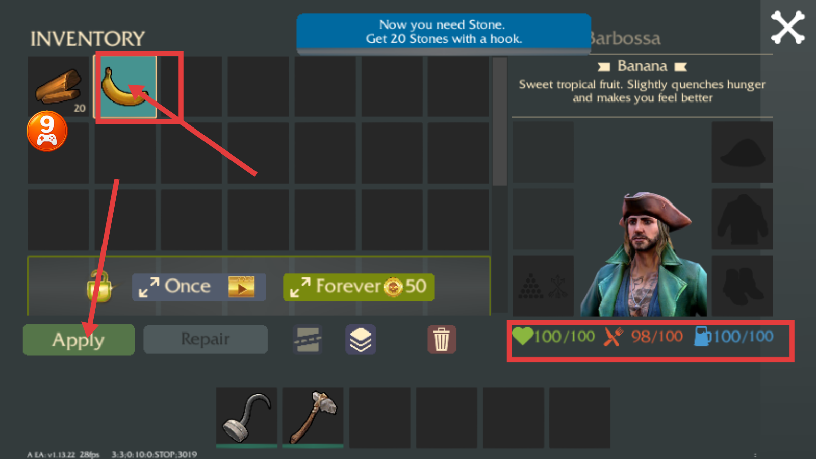 3、打开背包选择【香蕉】,点击【Apply】使用,提升饥饿值,维持【生命值-100/100】等生存状态。