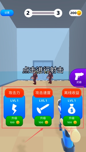 3、如何升级属性:击败敌人后,点击“升级”按钮提升角色的攻击力、攻击速度或离线收益。