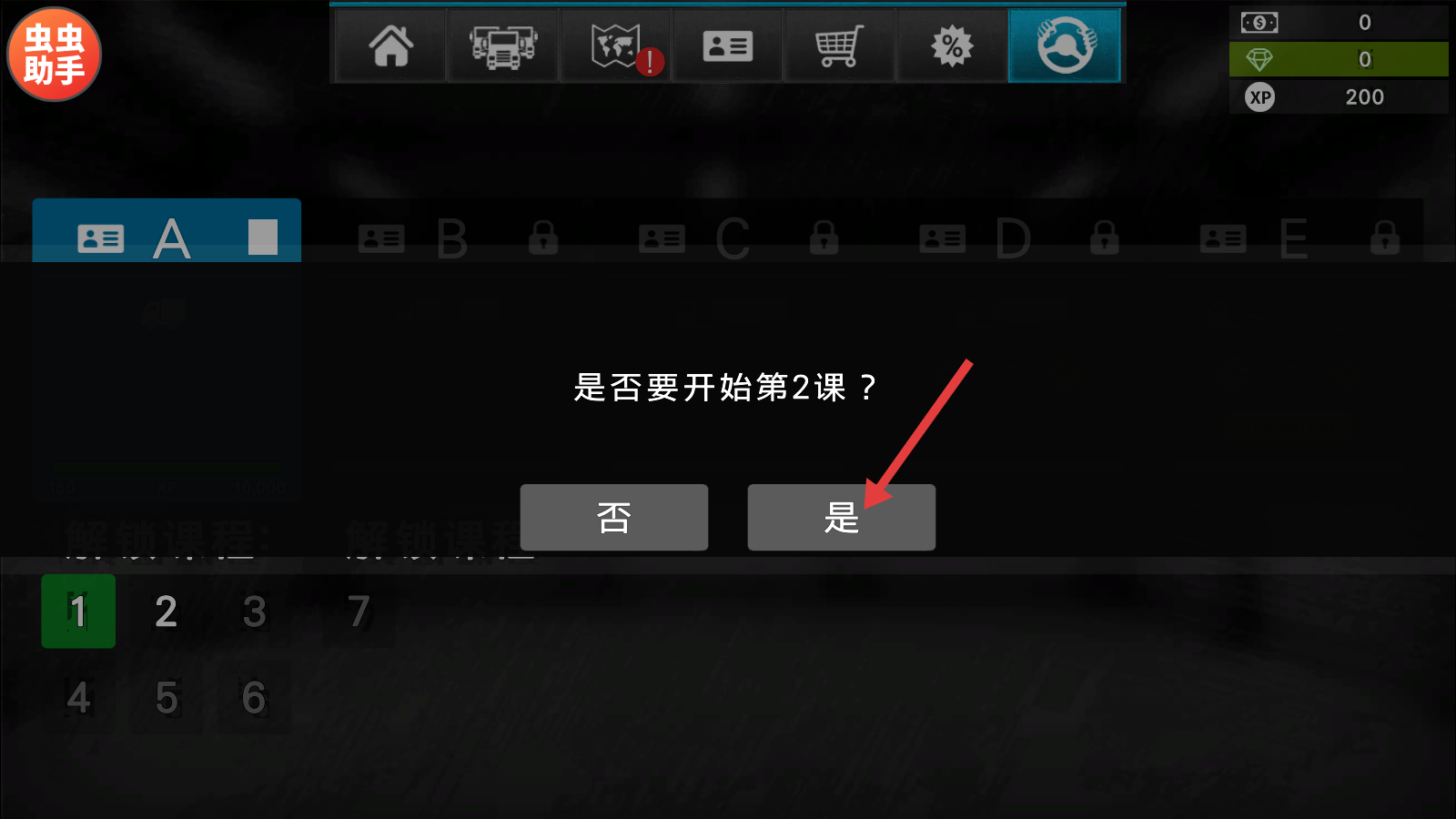 1、点击“是”,确认开启第2课,进入驾照进阶学习流程,提升驾驶技能。