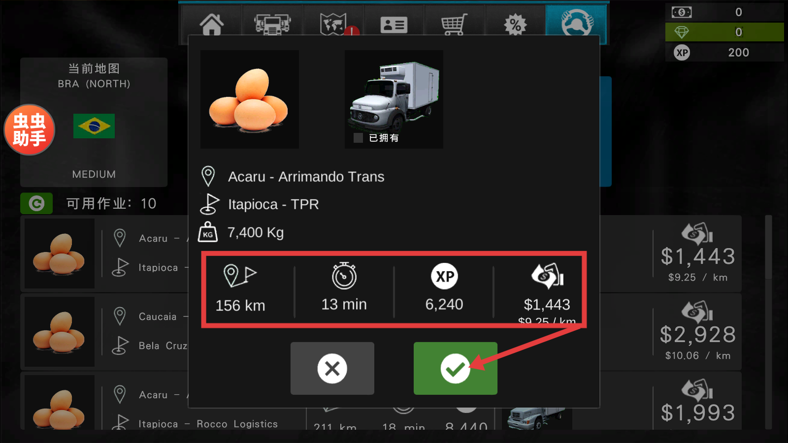 1、点击【绿色对勾】,接取【运输鸡蛋-任务】,明确距离【156km】、耗时【13min】、经验【6240】、报酬【$1443】。