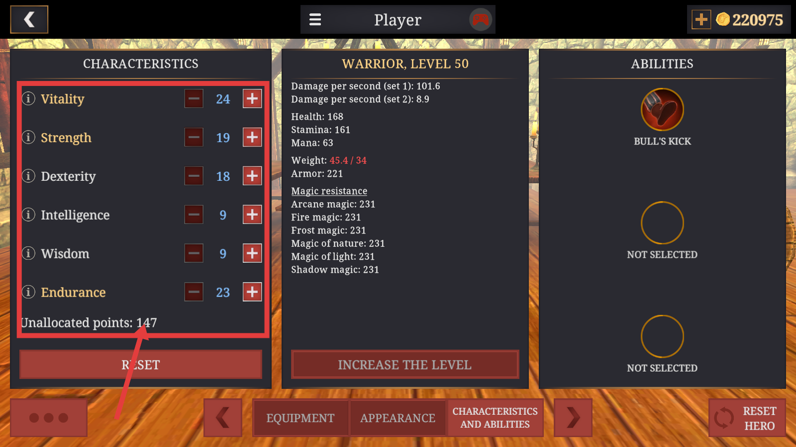 2、在属性界面,利用【Unallocatedpoints-147】,根据职业特性分配到【Vitality】等属性上,提升角色战力,同时可重置属性点调整build。