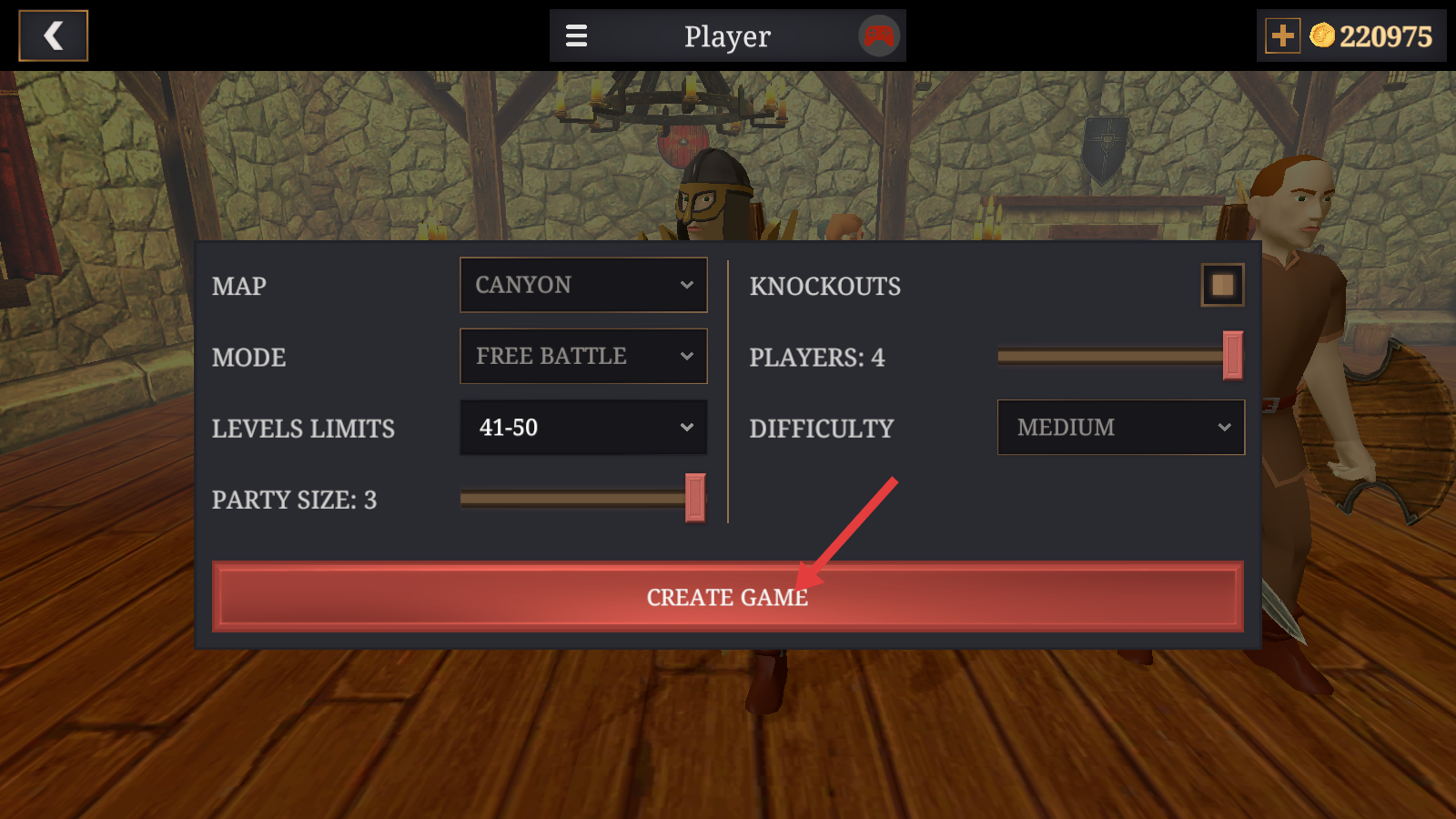 3、在创建游戏界面,选择【CANYON】地图、【FREEBATTLE】模式、【41-50】等级限制与【MEDIUM】难度后,点击开启对局。