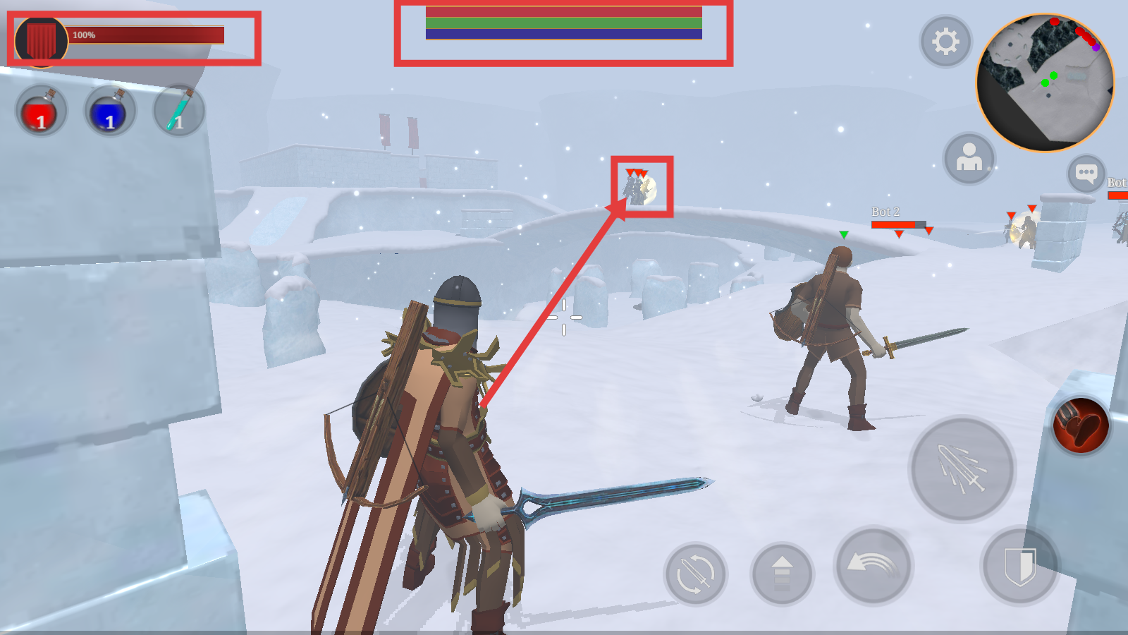 4、战斗中关注左上角血条与状态条,识别带红三角标记的敌人,在雪地场景中与队友配合,利用技能和武器击败敌人,推进战局。