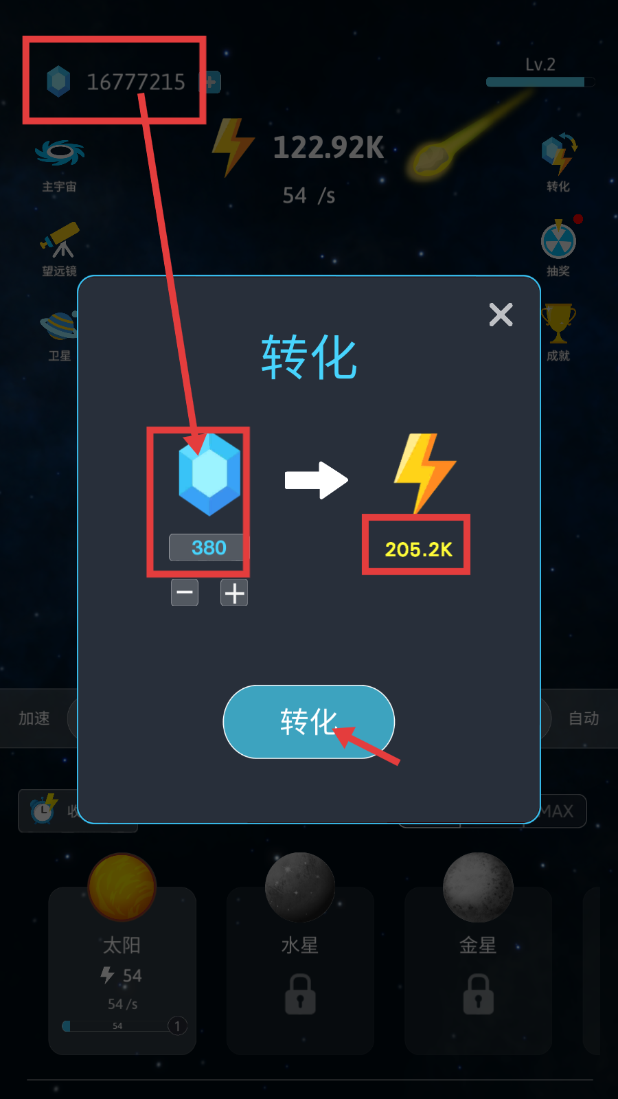 2、利用【转化】系统,将【蓝色晶体-380】转化为【闪电-205.2K】,点击【转化】按钮快速提升闪电资源储备。