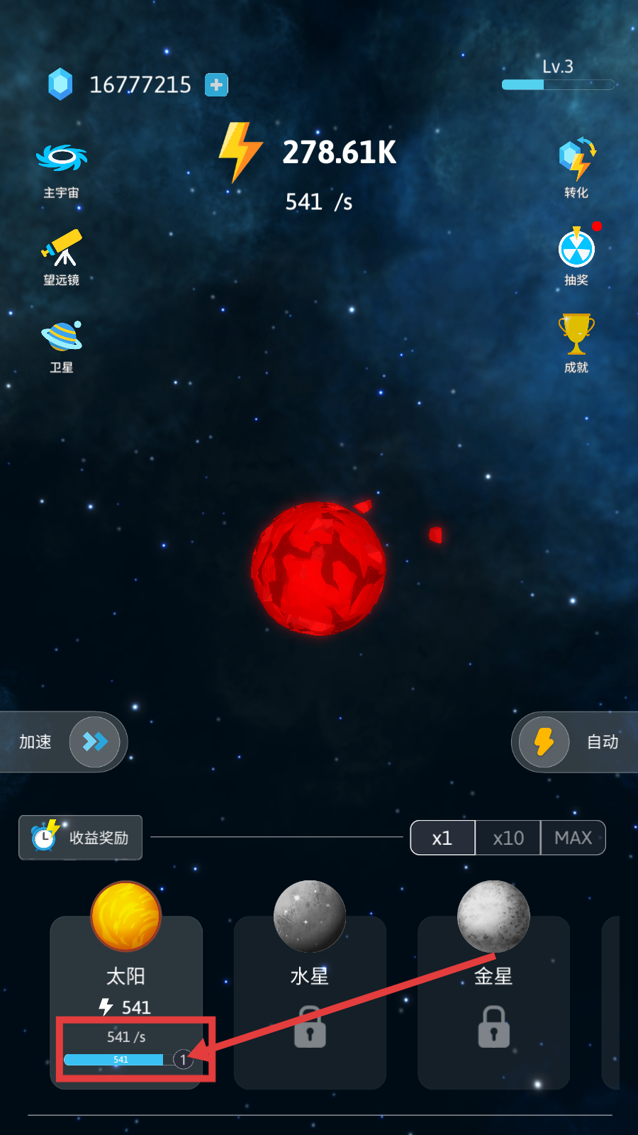 3、升级【太阳】,使其产能提升至【541/s】,大幅加快资源获取速度,推进游戏进程。