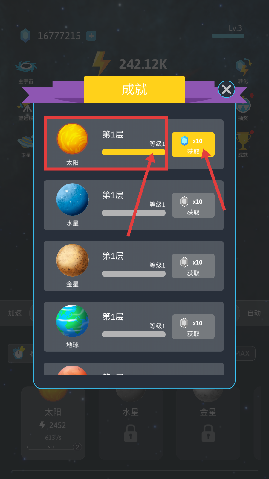 4、参与【成就】系统,完成【太阳-第1层】成就,获取【晶体-x10】奖励,助力天体发展与资源积累。