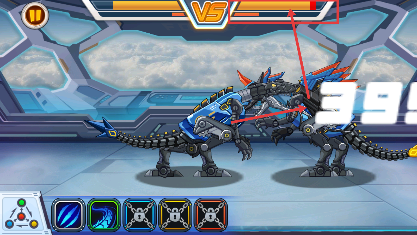 2、对战中操控机械恐龙,利用下方技能按钮(如蓝色刃状、龙形技能)攻击敌方机械恐龙,合理释放技能提升伤害。