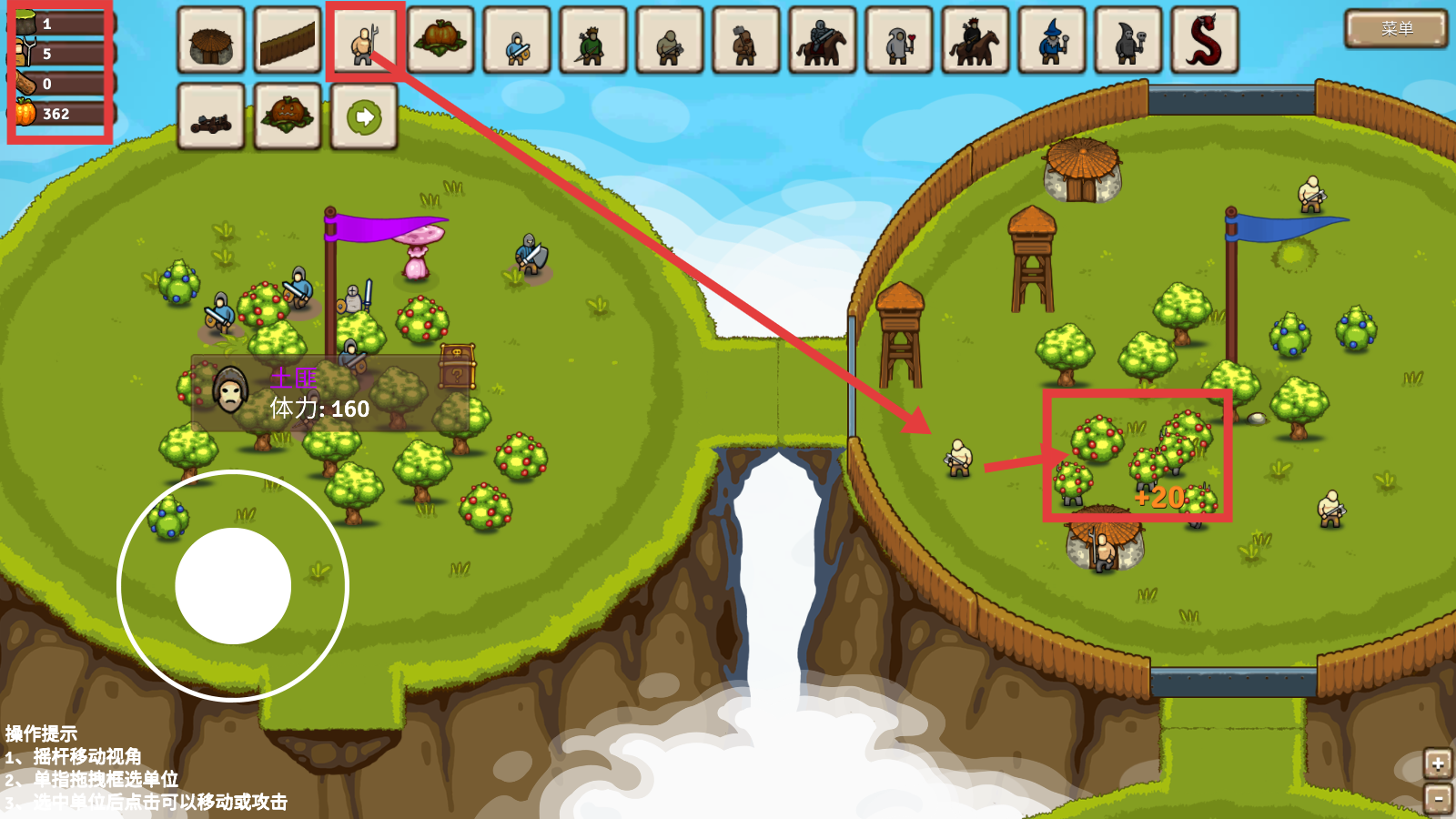 2、点击单位图标派出工人,优先收集【苹果】等资源,关注左上角资源栏(如【南瓜-362】),保障资源充足以发展建筑和军队。