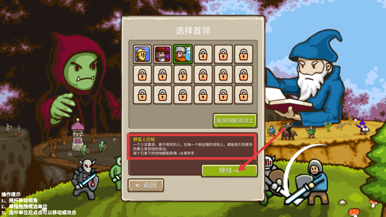 1、选择【野蛮人巴格】为首领,其每占领领地可获【+3掷斧手】加成,点击【继续->】开始游戏,利用首领特性快速扩张。