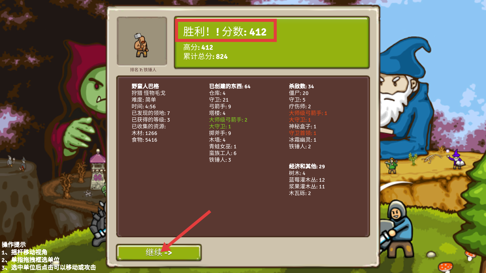 4、战斗胜利后获得【分数-412】,点击【继续->】查看战果详情,总结本次战斗的资源、单位等数据,为下一局积累经验。