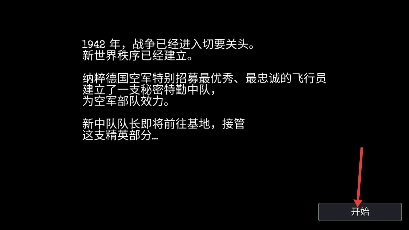 1、点击【开始】按钮进入游戏,了解背景为1942年纳粹德国空军秘密特勤中队的设定,开启飞行作战之旅。