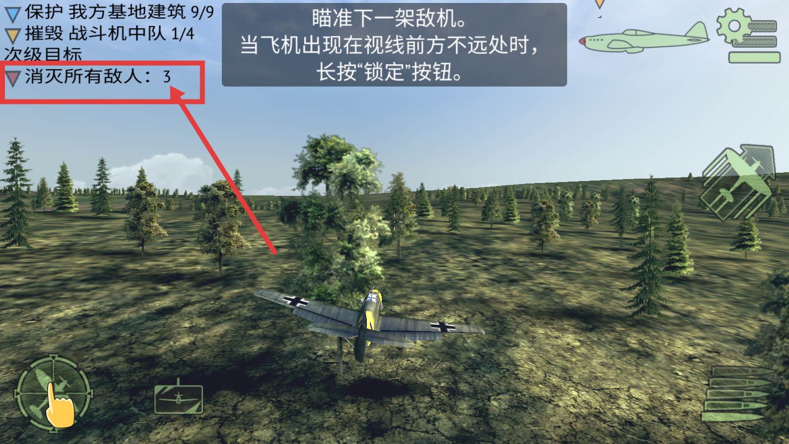 4、关注【消灭所有敌人-3】的进度,当敌机出现在视线前方不远处时,长按【锁定】按钮,继续完成摧毁战斗机中队的任务。