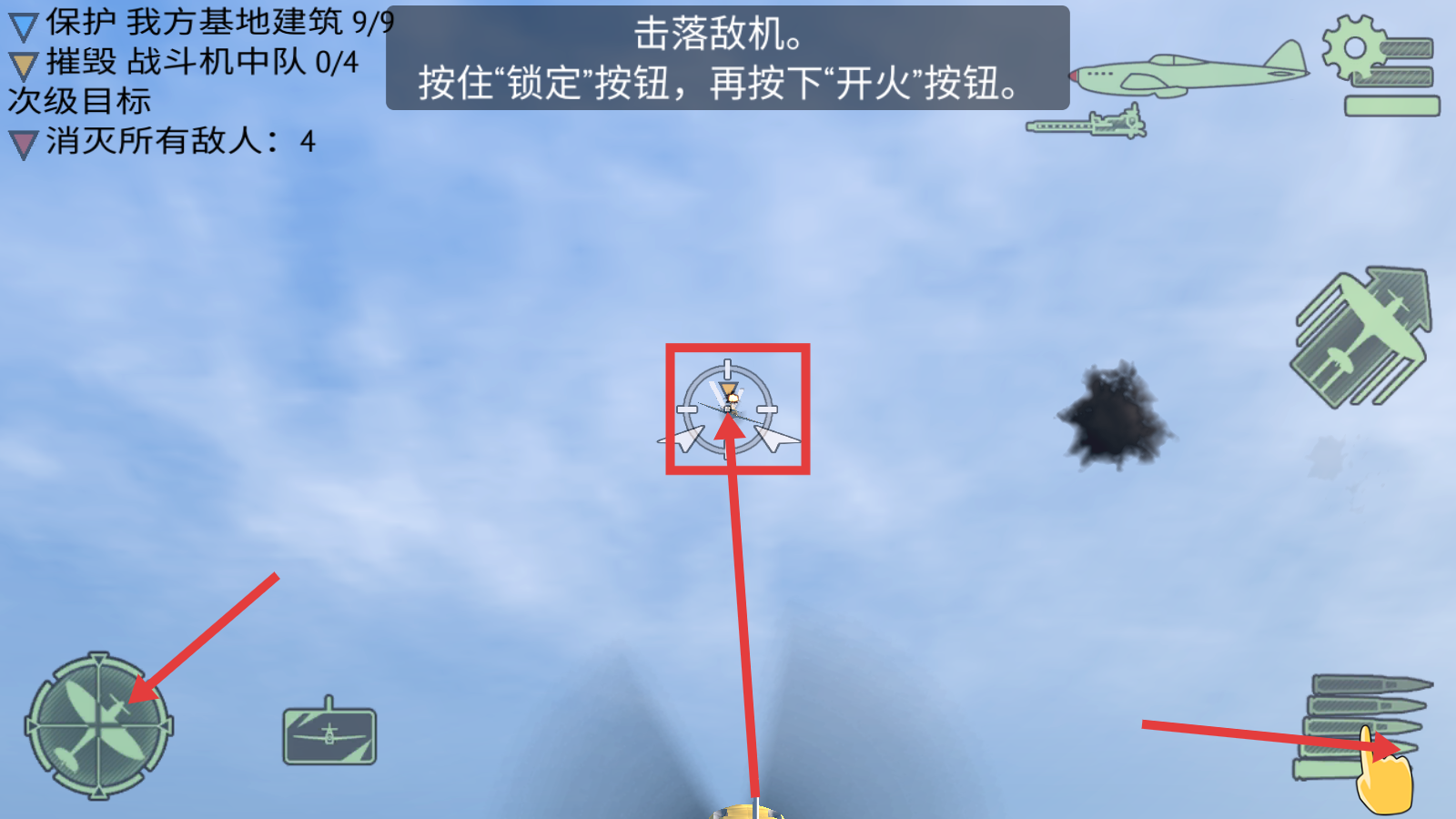 3、击落敌机时,按住【锁定】按钮再按【开火】按钮,按照操作提示精准打击敌机,推进任务进度。