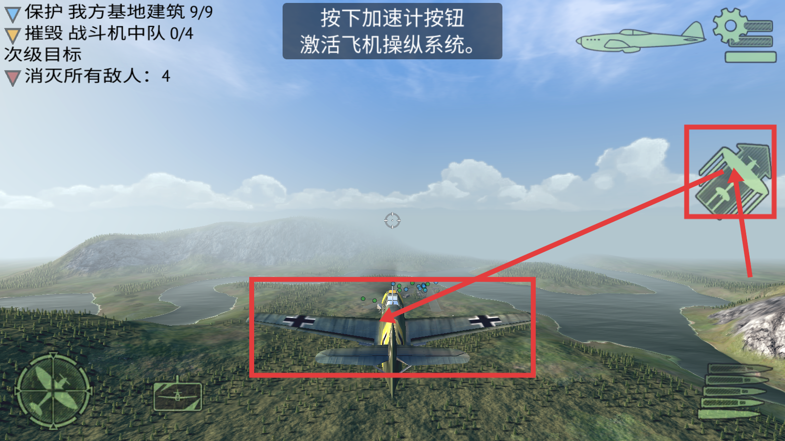 2、按下加速计按钮激活飞机操纵系统,同时关注【保护我方基地建筑-9/9】等任务目标,开启战斗准备。