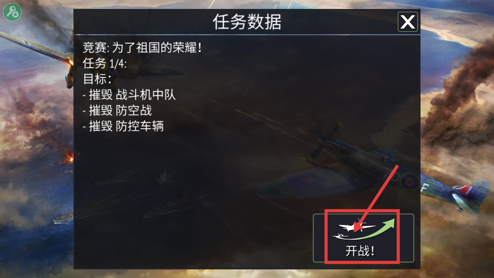 1、查看【任务数据】,明确竞赛【为了祖国的荣耀!】及摧毁战斗机中队、防空战、防控车辆的目标,点击【开战!】开启任务。