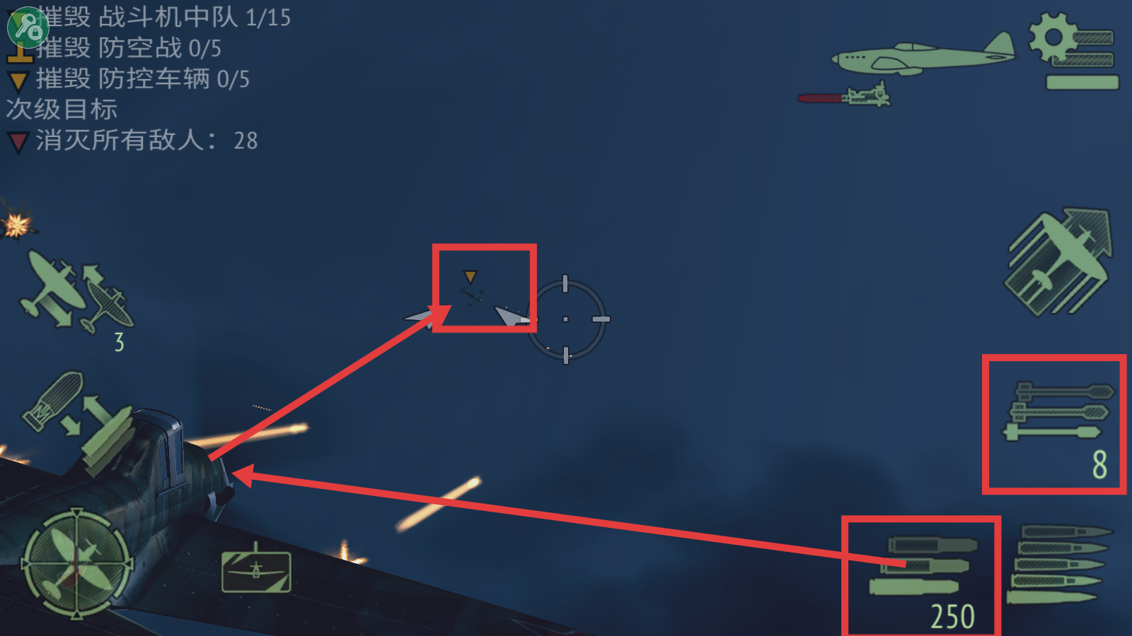 3、战斗时利用【250】弹药、【8】火箭等武器攻击敌机,推进【摧毁战斗机中队-1/15】的任务进度,同时消灭敌人。