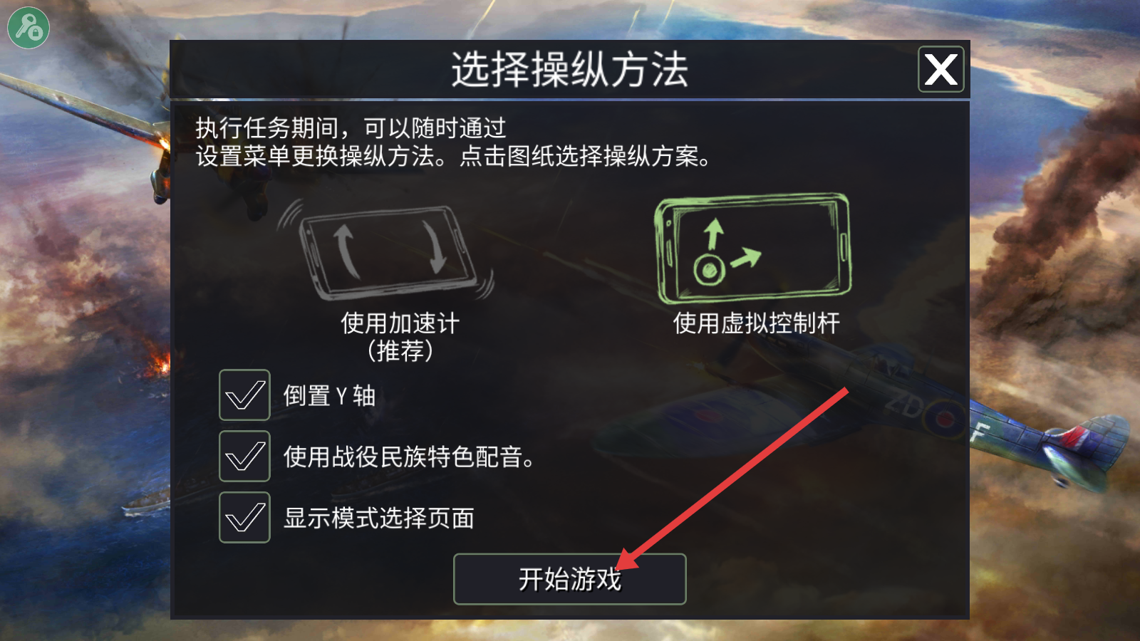 1、在【选择操纵方法】界面,可选择【使用加速计(推荐)】或【使用虚拟控制杆】,确认设置后点击【开始游戏】。