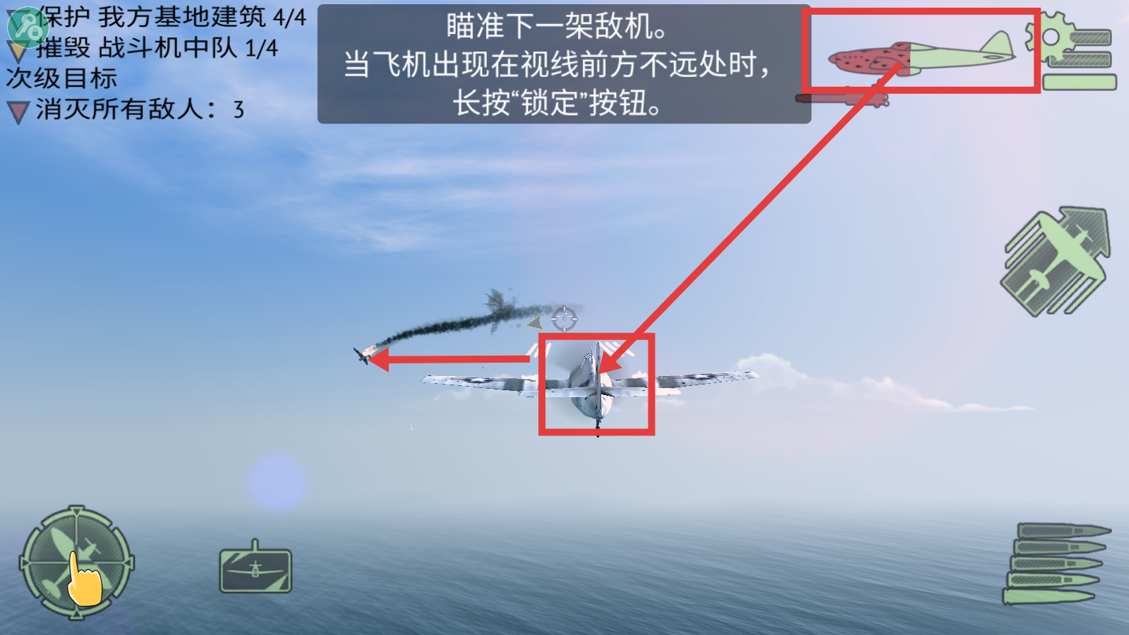 3、瞄准下一架敌机,当飞机出现在视线前方不远处时,长按【锁定】按钮,推进【摧毁战斗机中队-1/4】【消灭所有敌人-3】的任务进度。