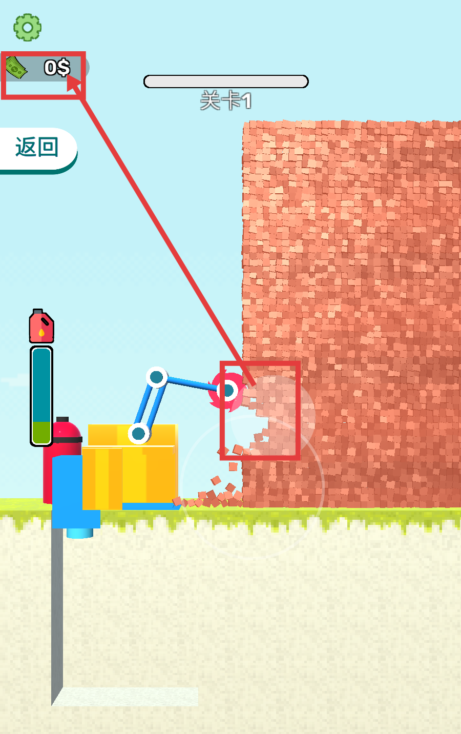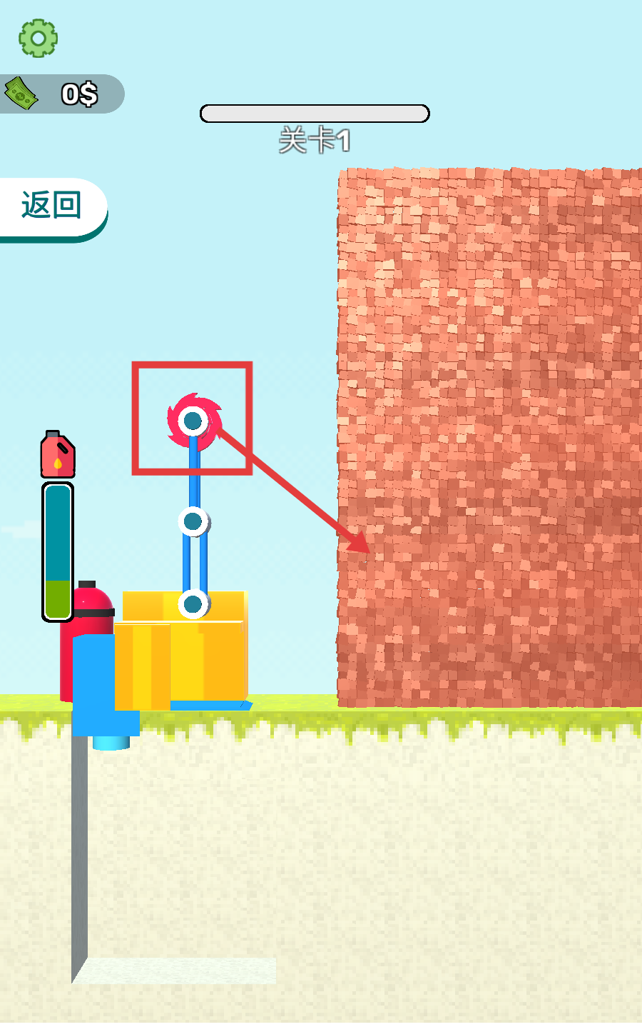 1、在【关卡1】,使用红色旋转工具开始挖掘砖块,开启关卡挑战。