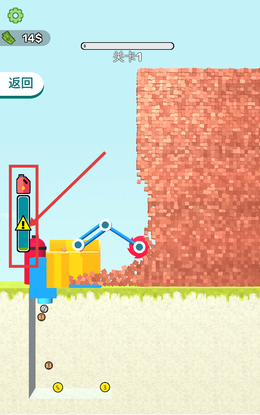 4、燃料耗尽后,可获取【+99$】奖励,继续游戏以完成关卡挖掘任务。
