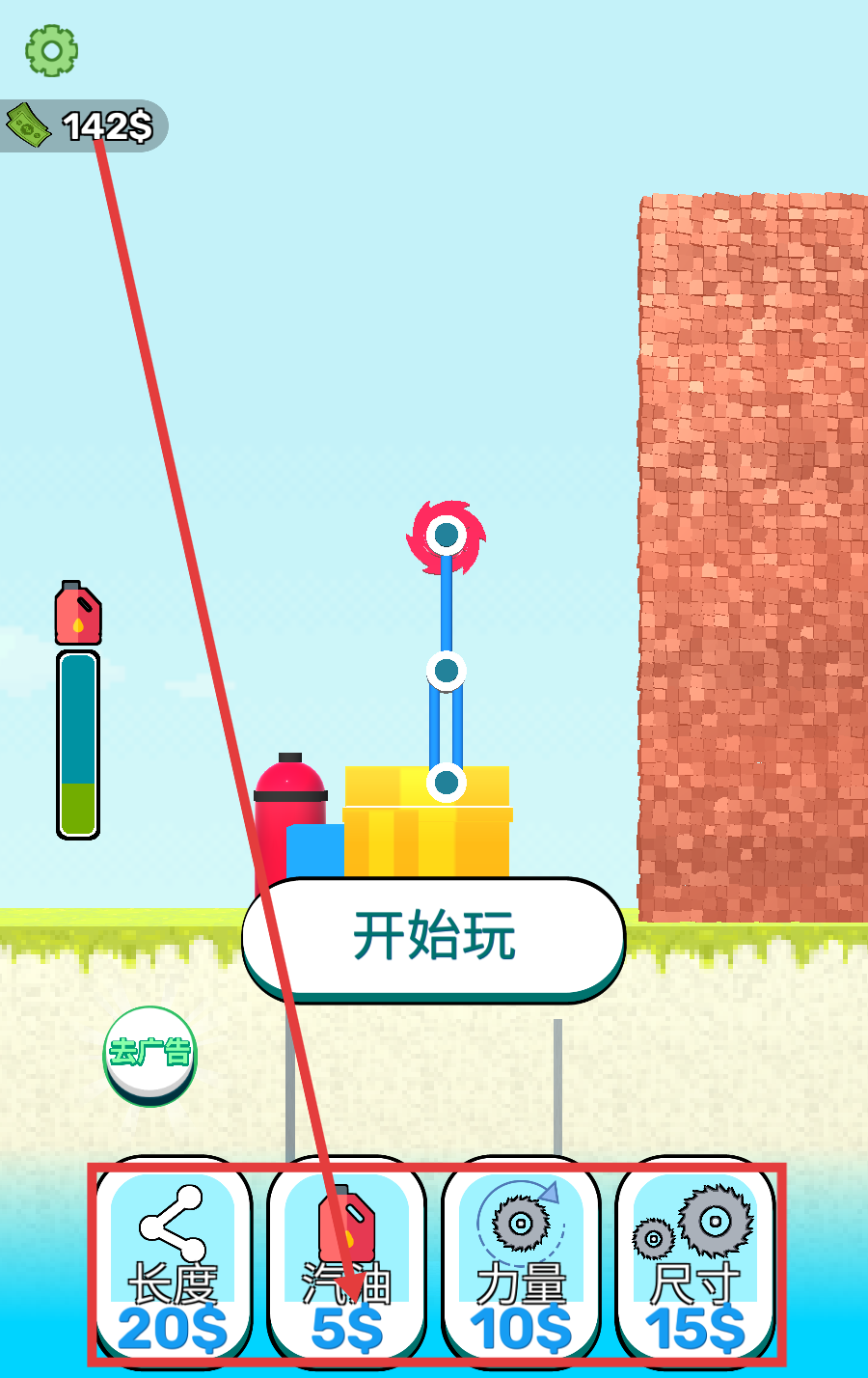 1、使用积累的【142$】升级【长度-20$】【汽油-5$】【力量-10$】【尺寸-15$】等,点击【开始玩】开启关卡挖掘。