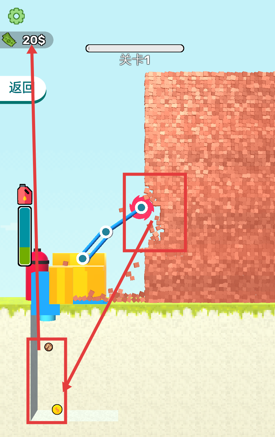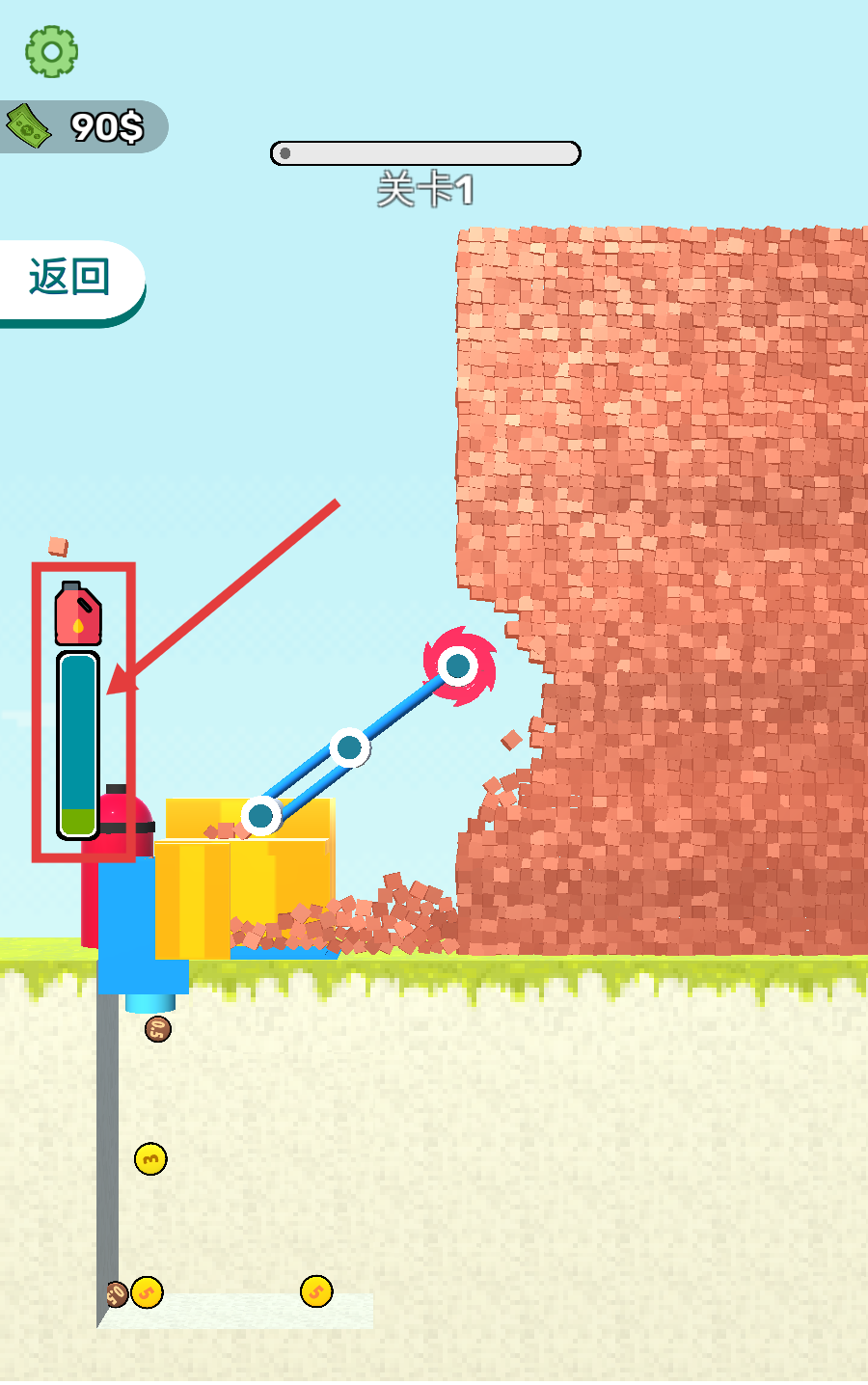 3、挖掘时关注【汽油】消耗,合理控制挖掘节奏,积累金钱至【90$】,持续推进关卡1挖掘。