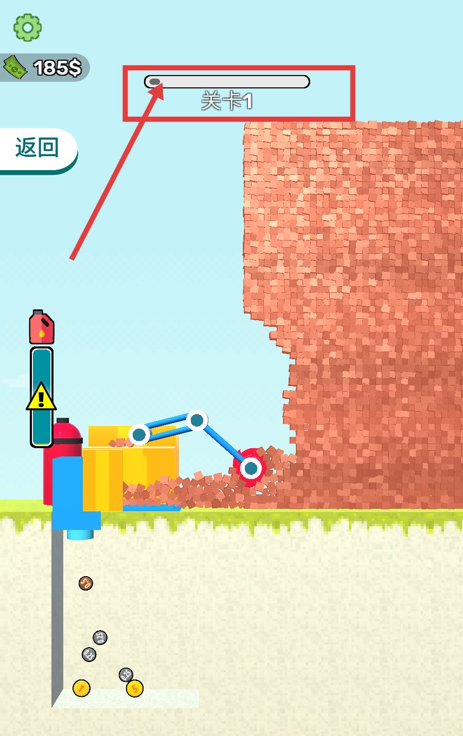 4、留意【关卡1】进度条,即使汽油出现警告,仍可继续挖掘砖块,积累金钱至【185$】,推进关卡进度。