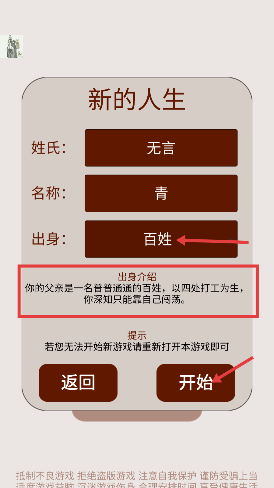 1、进入游戏先查看【新的人生】界面,姓氏无言、名称青、出身百姓,了解出身介绍后点击【开始】,开启明朝人生旅程。