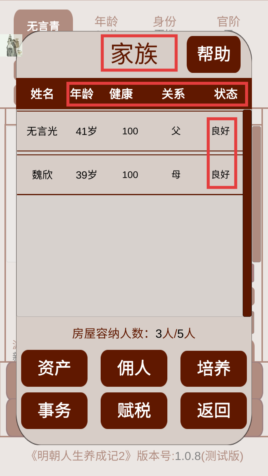 2、进入游戏后查看【家族】界面,关注成员的年龄、健康、关系和状态,了解家族成员情况以便规划发展。
