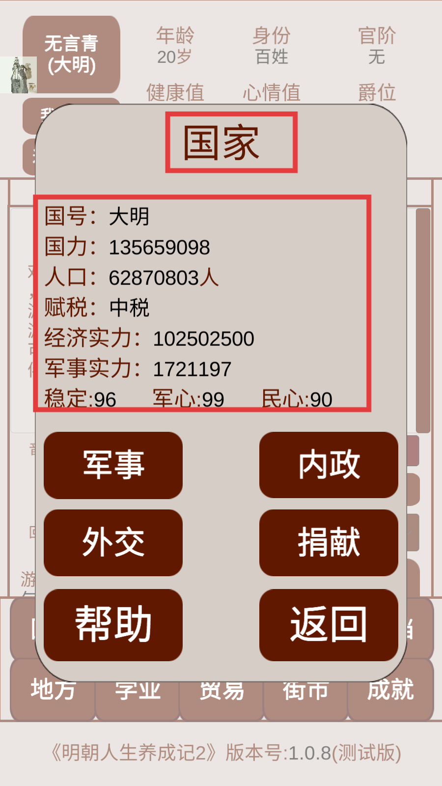 3、在【国家】界面中,查看大明的国力、人口、赋税等信息,掌握国家整体状况,为后续发展做准备。