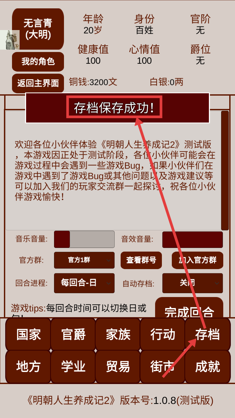 4、游戏过程中记得点击【存档】按钮,确保【存档保存成功】,避免进度丢失,保障游戏体验。