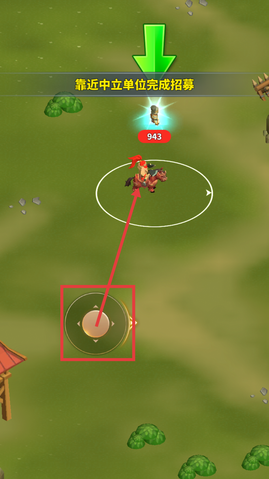 1、利用移动圆盘操控角色,靠近中立单位(如标识943的单位),完成招募以壮大队伍。