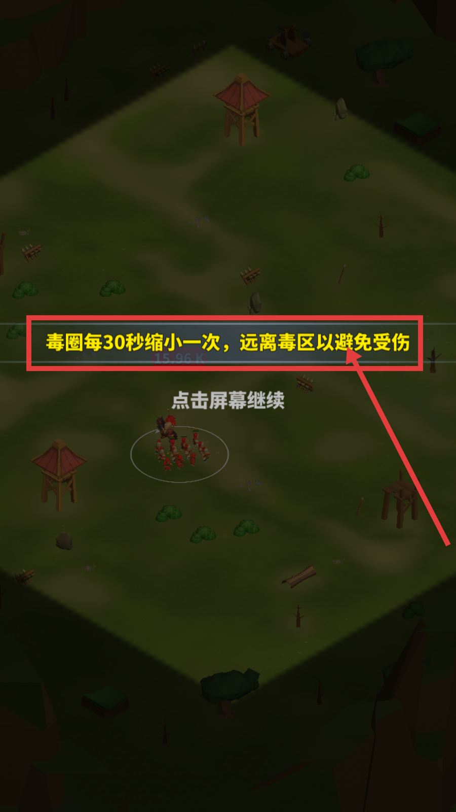 3、留意【毒圈每30秒缩小一次,远离毒区以避免受伤】的提示,及时远离毒区,防止受伤。