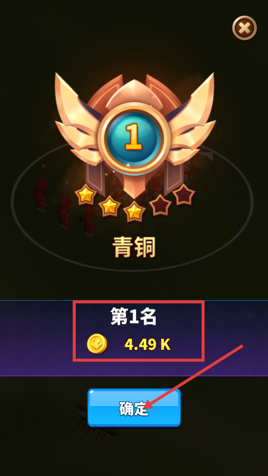4、努力战斗争取排名,获得第1名后可领取【4.49K】金币奖励,点击【确定】继续游戏。