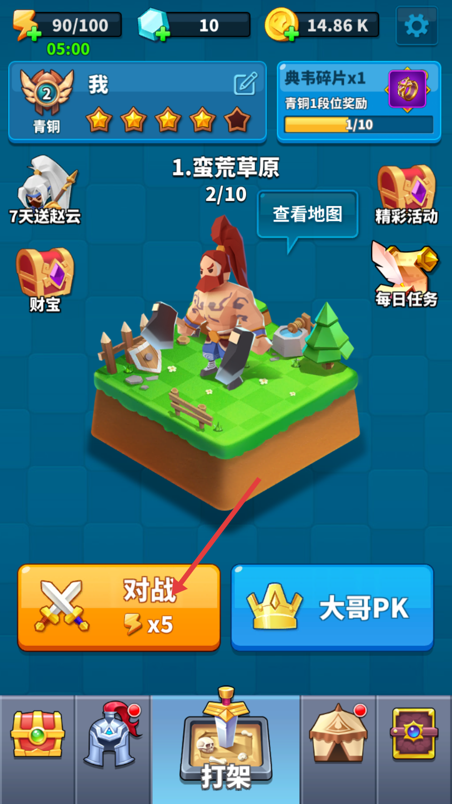 1、进入游戏主界面,点击【对战】按钮参与战斗,关注【蛮荒草原-2/10】进度,积累资源提升战力。