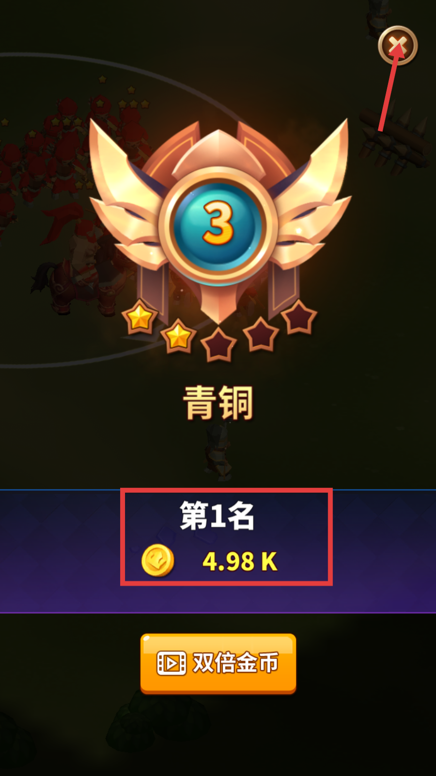 4、战斗结束后,若获得第1名,可领取【4.98K】金币奖励,点击右上角关闭按钮返回主界面继续挑战。