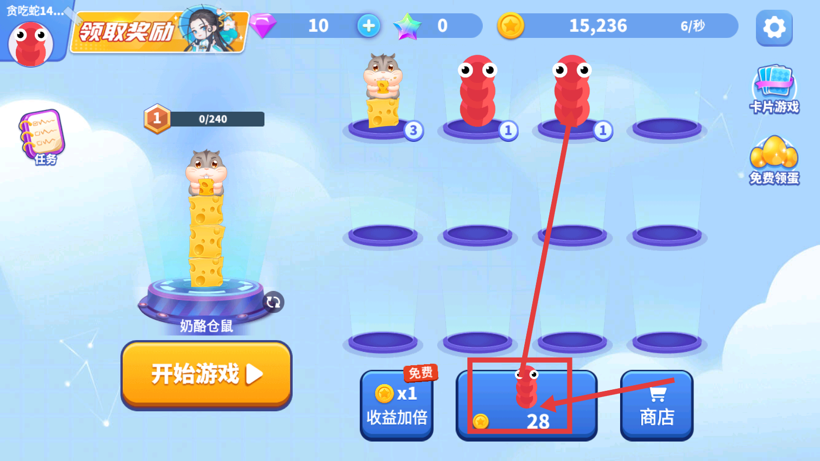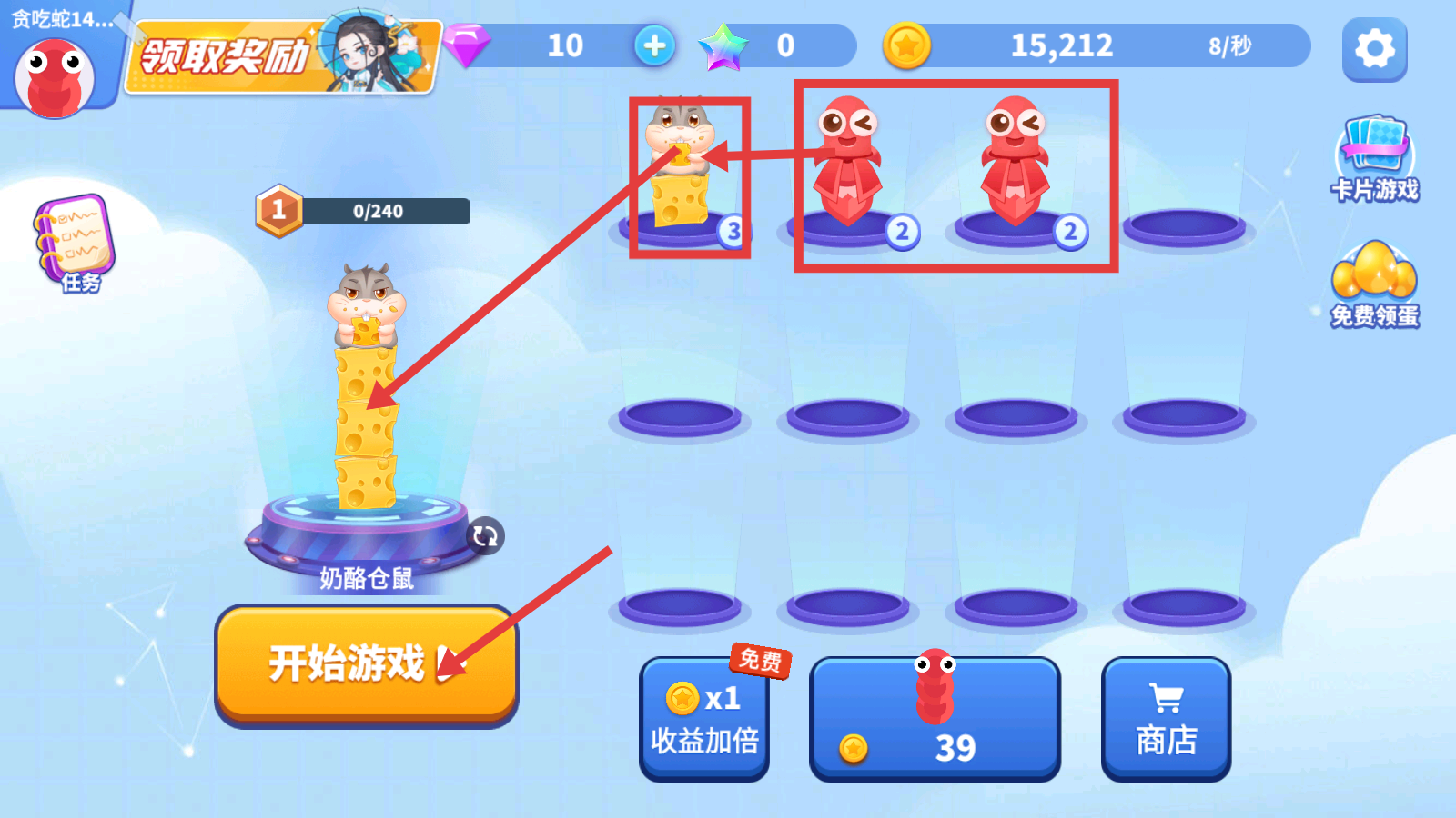 2、点击【开始游戏】,操控升级后的贪吃蛇挑战【奶酪仓鼠】,利用升级优势争取胜利。