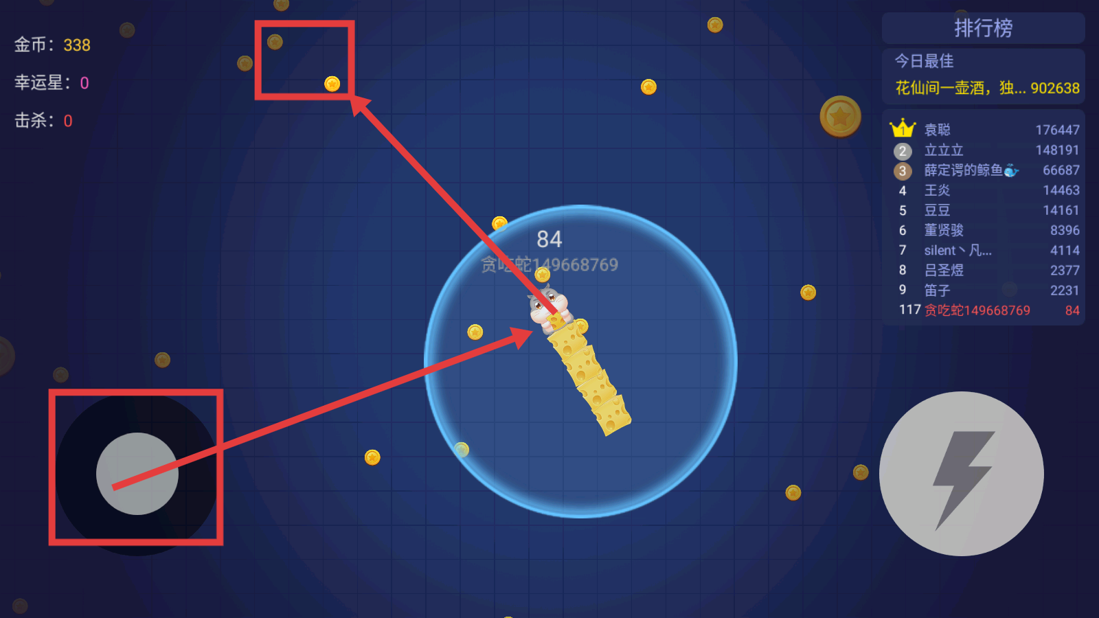 3、在游戏中控制贪吃蛇收集【金币】,留意排行榜,合理使用操控键和闪电道具,提升对局表现。
