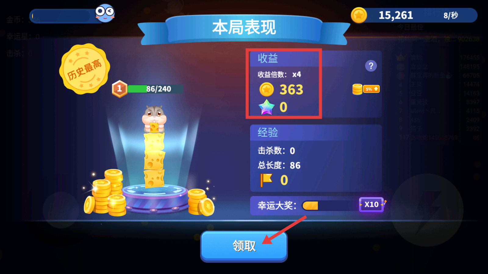 4、对局结束后点击【领取】,获取【363】金币和经验,积累资源用于贪吃蛇升级和后续挑战。