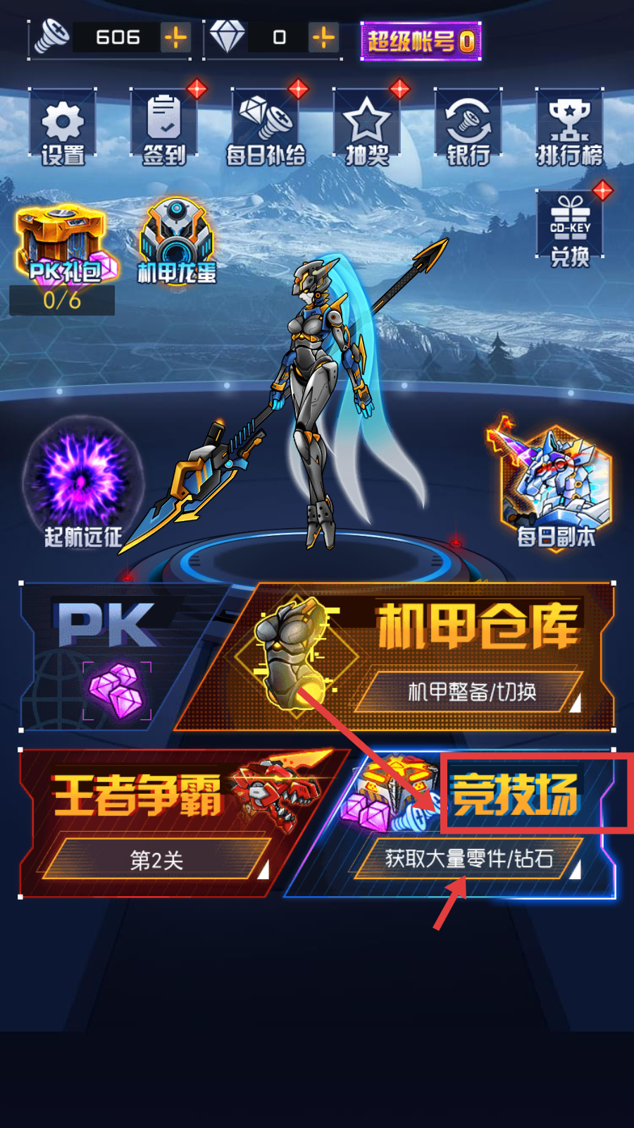 1、点击【竞技场】,参与竞技对战,可获取大量零件和钻石,提升机甲战力,优先熟悉该玩法入口和奖励机制。