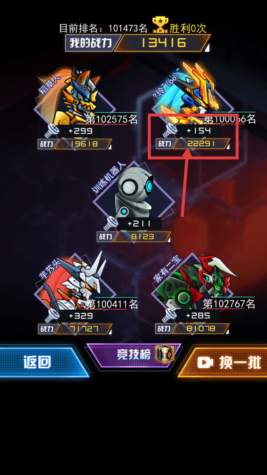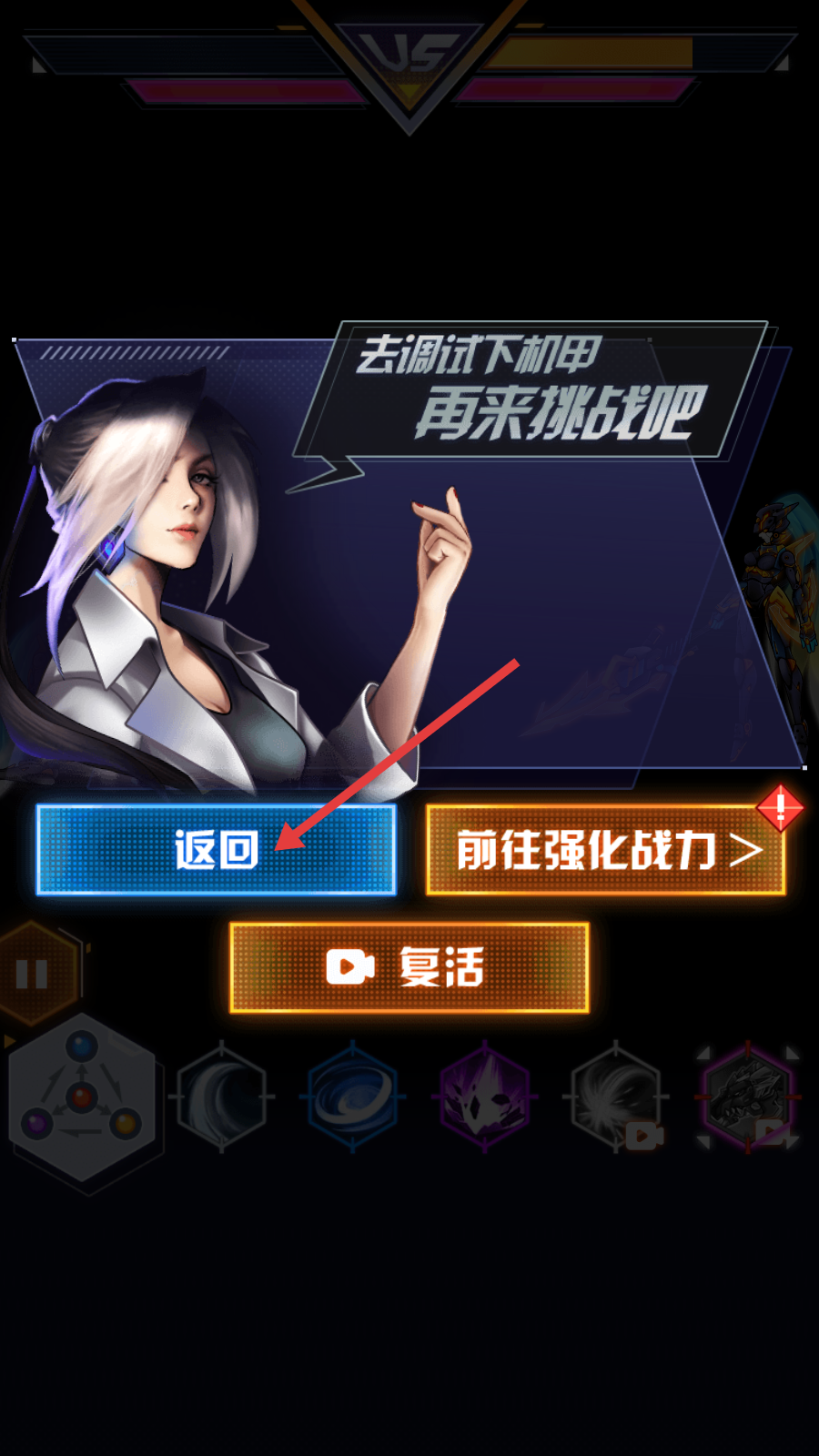 4、若挑战失败,点击【返回】按钮,可选择前往强化战力,调试机甲后再进行挑战,积累战力后提升竞技表现。