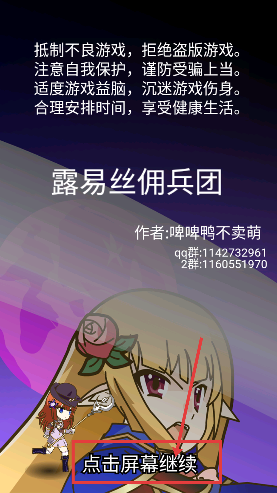 1、点击屏幕继续,进入【露易丝佣兵团】游戏,开启冒险之旅,熟悉游戏初始界面和操作。