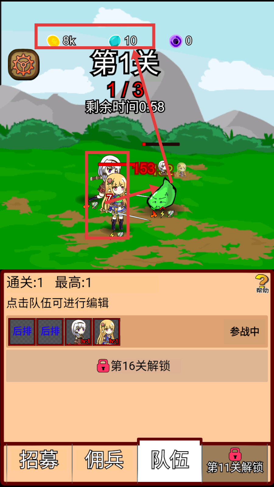 2、在【第1关】战斗中,利用现有佣兵队伍作战,关注金币8k和钻石10的资源情况,积累战斗经验。