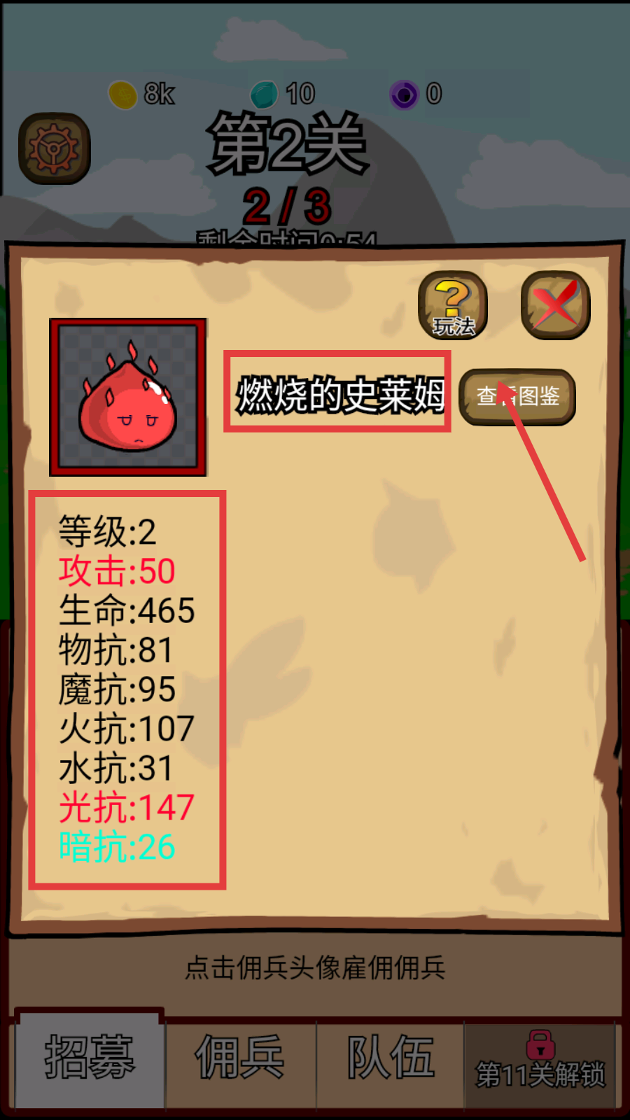 3、遇到【燃烧的史莱姆】时,点击查看图鉴,了解其等级、攻击、生命等属性,制定针对性战斗策略。